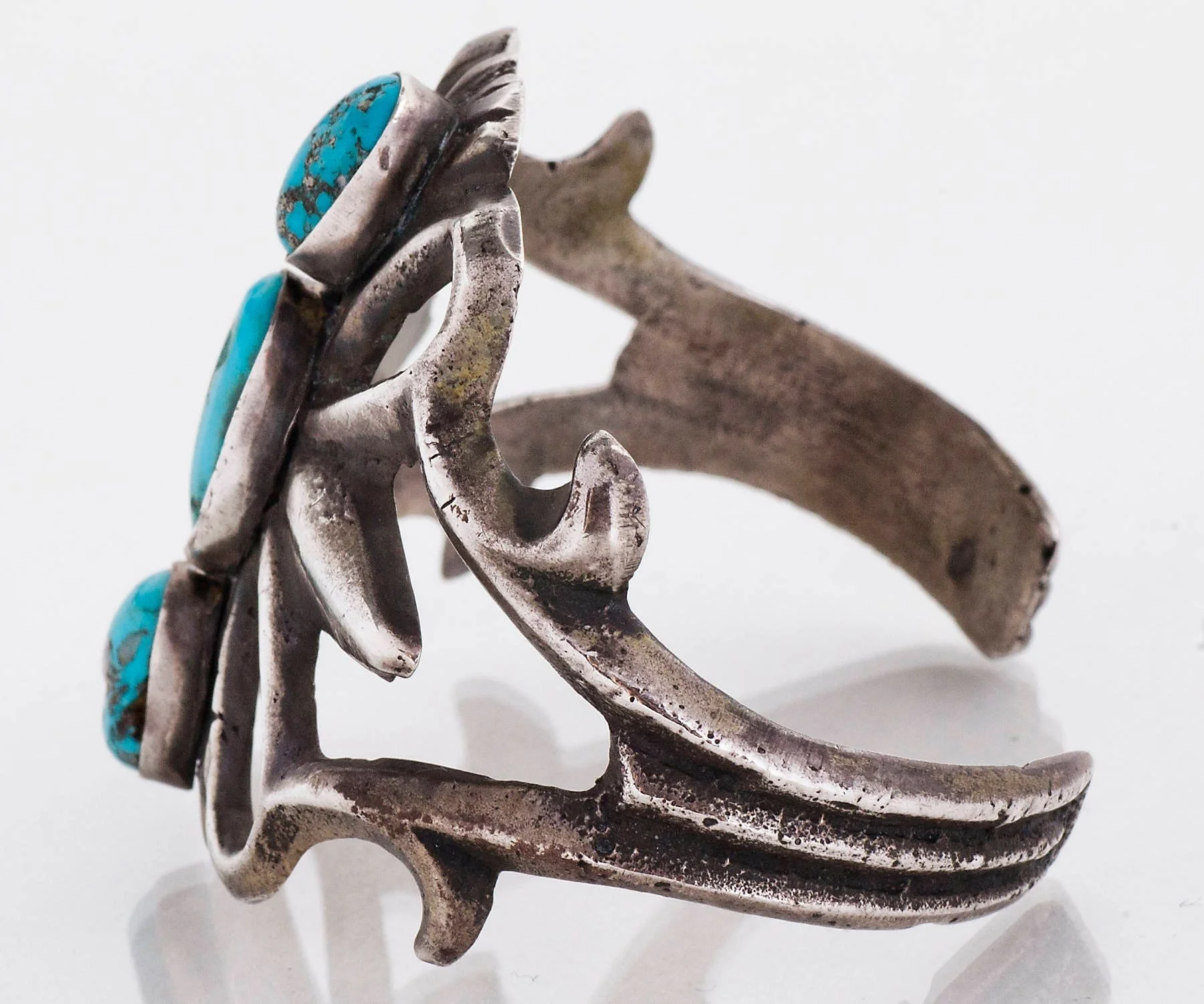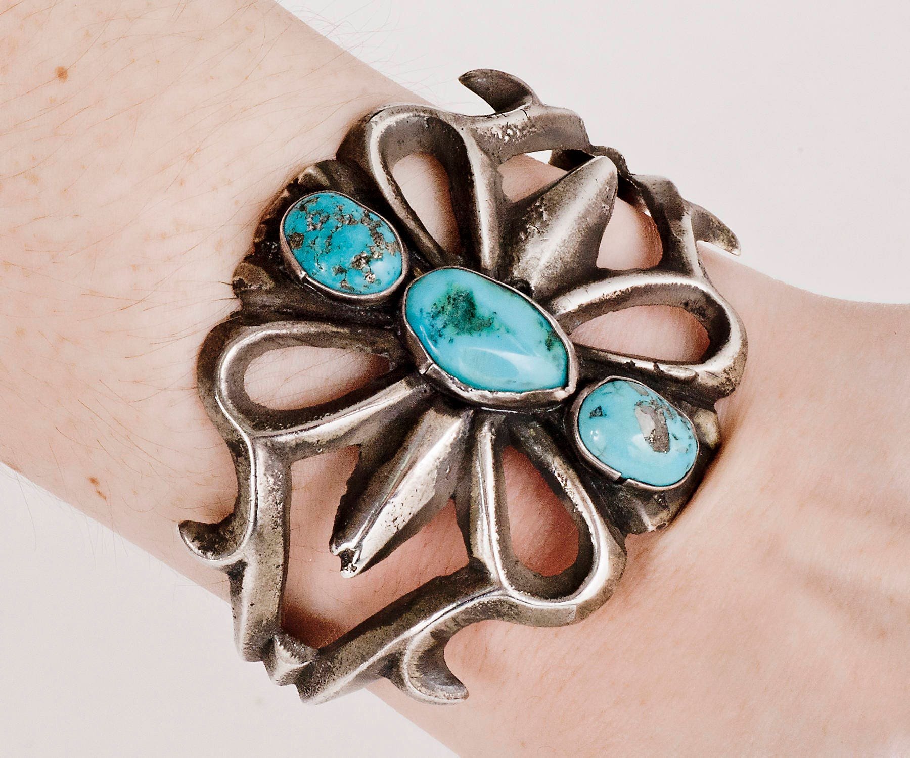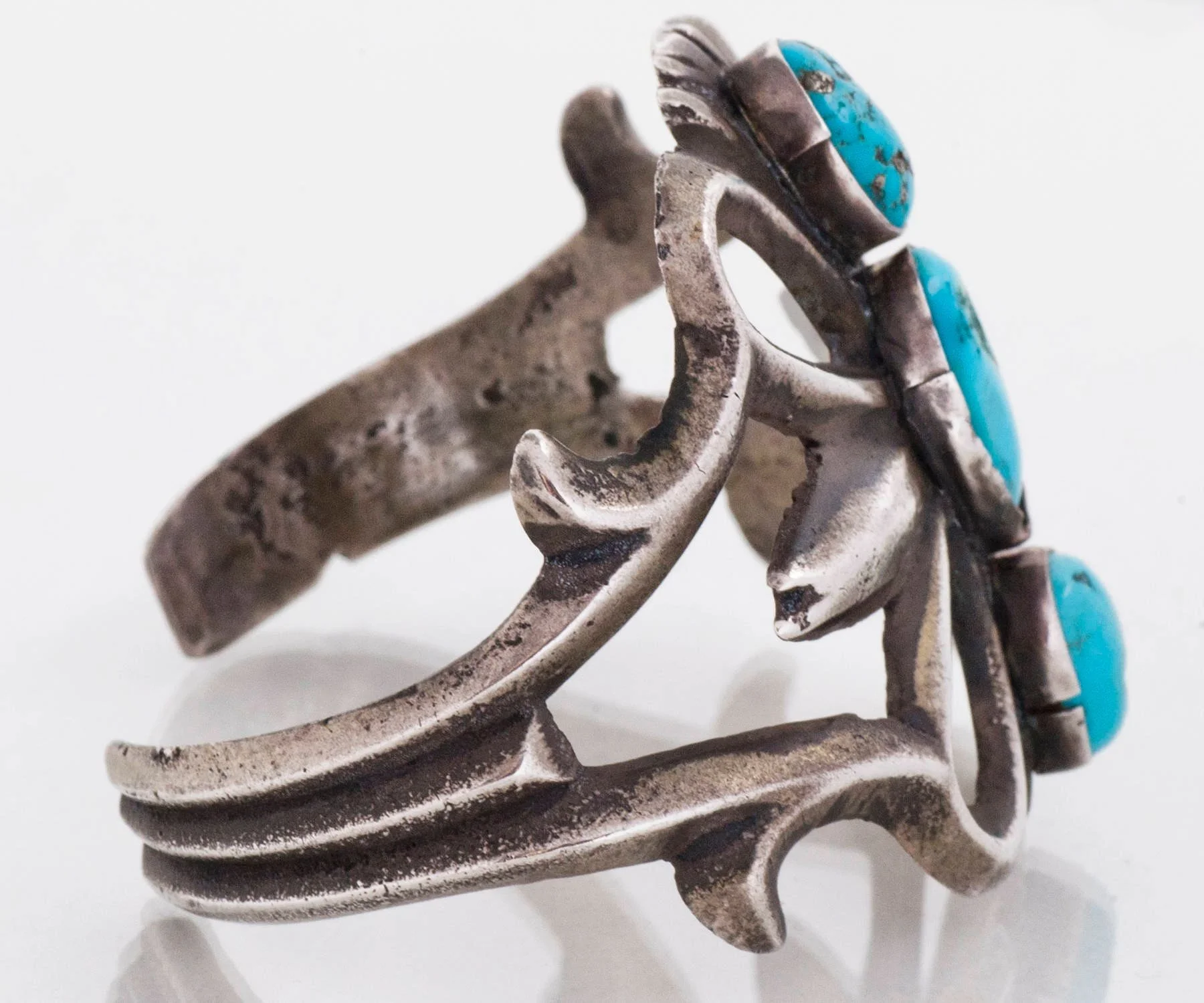 This bold and beautiful Navajo turquoise and sterling silver cuff bracelet will make a statement on your wrist. Three light blue turquoise stones are bezel set inside a lovely floral pattern cuff bracelet. This piece will make a true statement on your wrist.