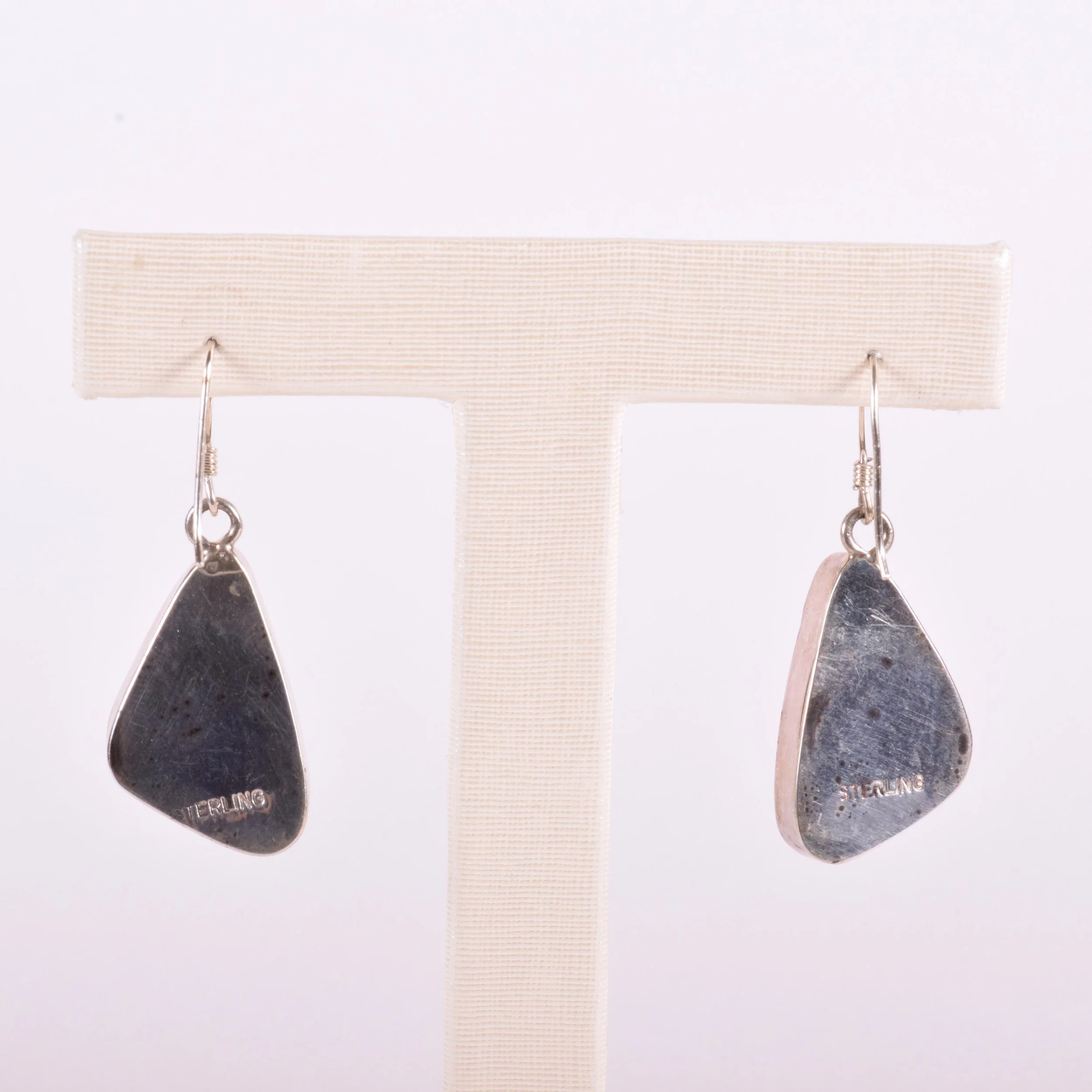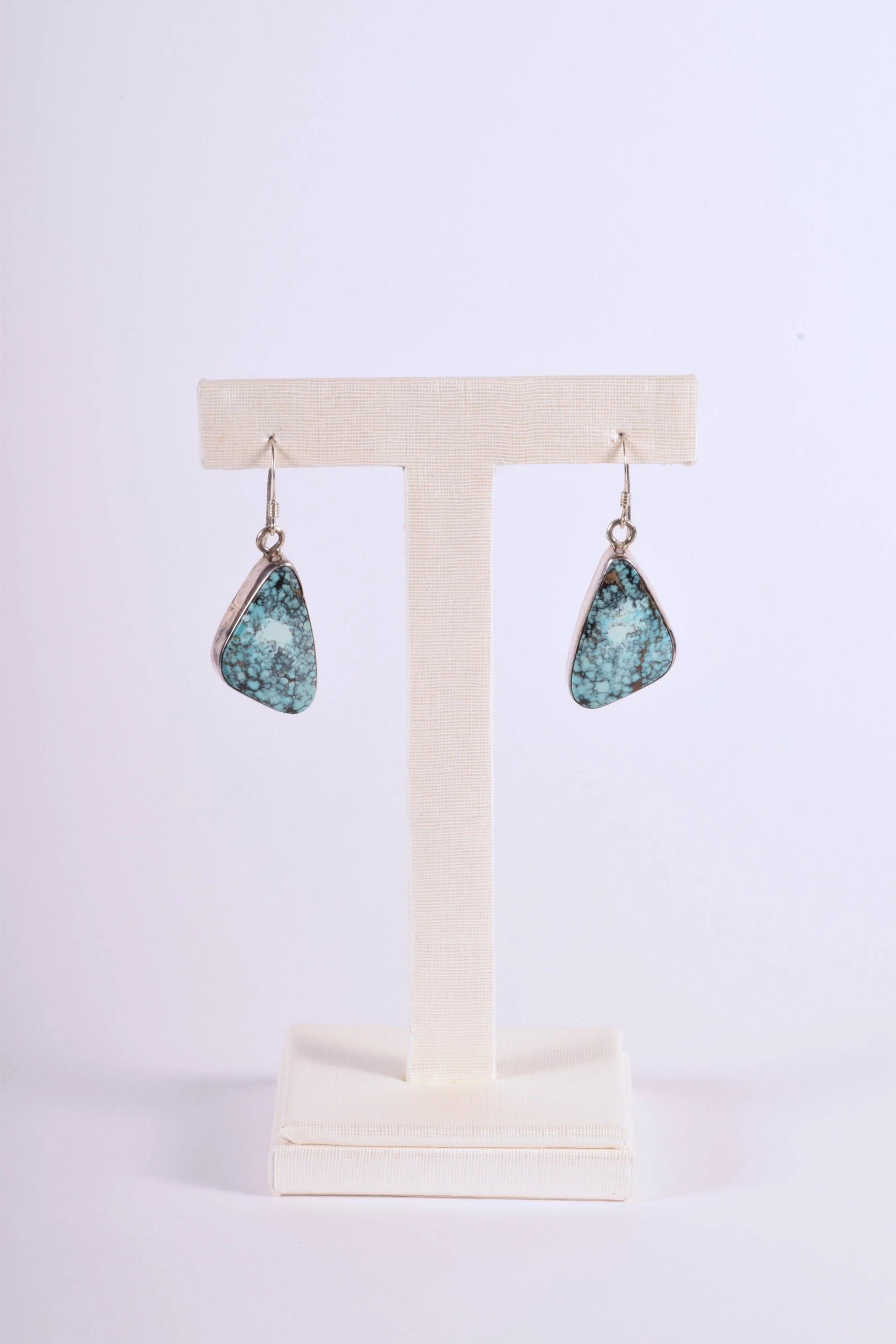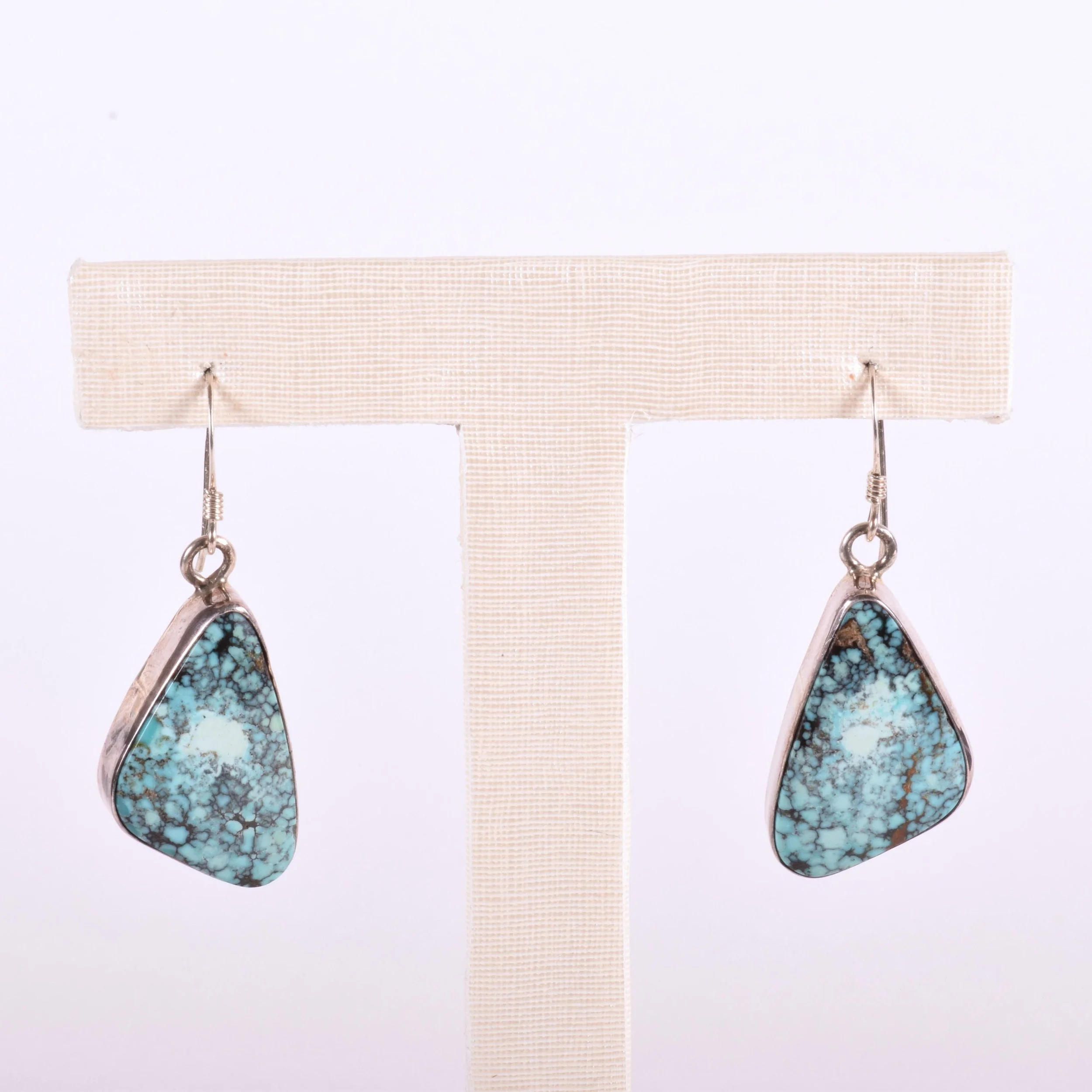 Enchanting spider webbed matrix in turquoise, one of the rarer types of mined turquoise. This is a great pair of vintage Native American dangle turquoise earrings in sterling silver. The turquoise stones are bezel set.