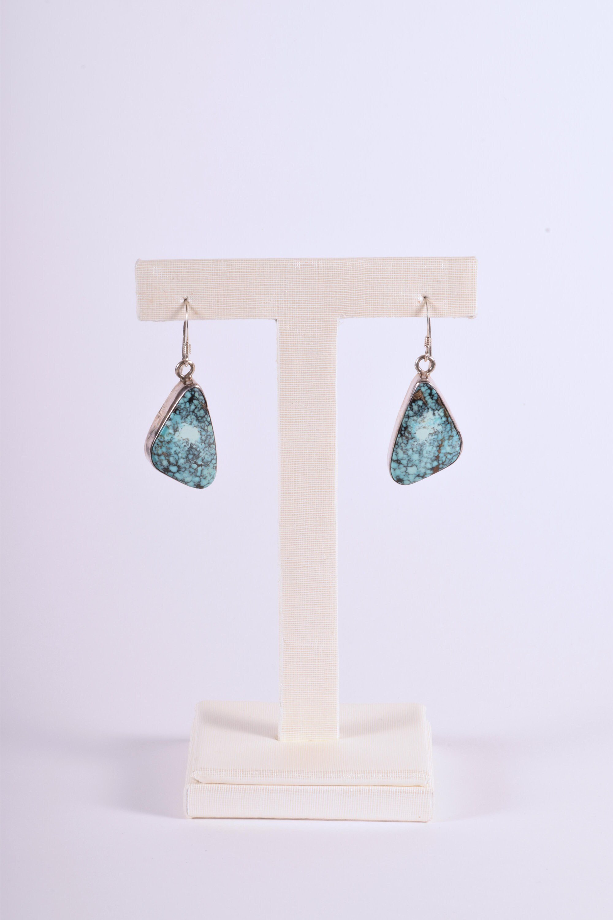 Enchanting spider webbed matrix in turquoise, one of the rarer types of mined turquoise. This is a great pair of vintage Native American dangle turquoise earrings in sterling silver. The turquoise stones are bezel set.