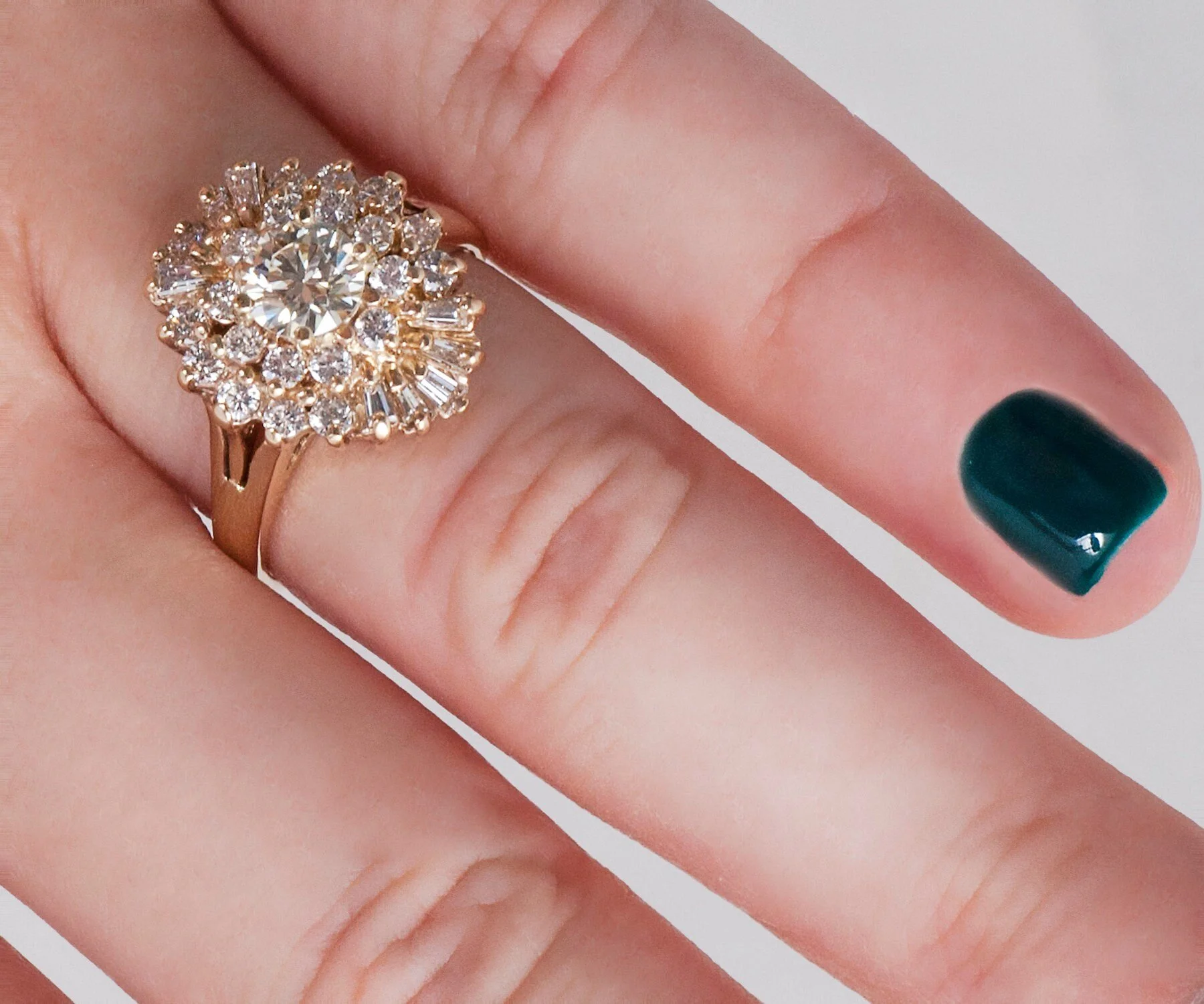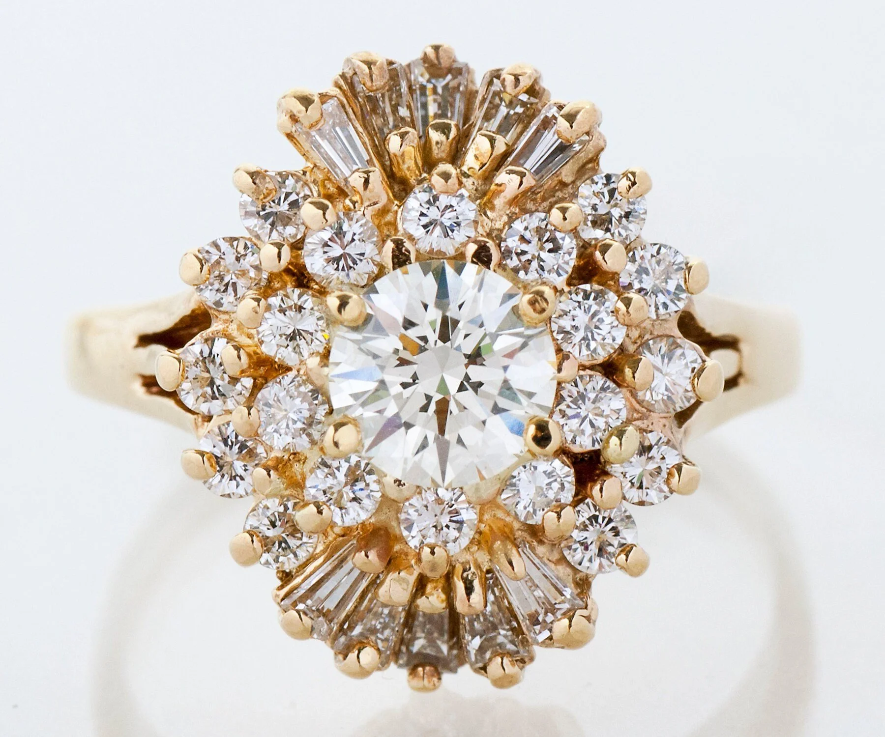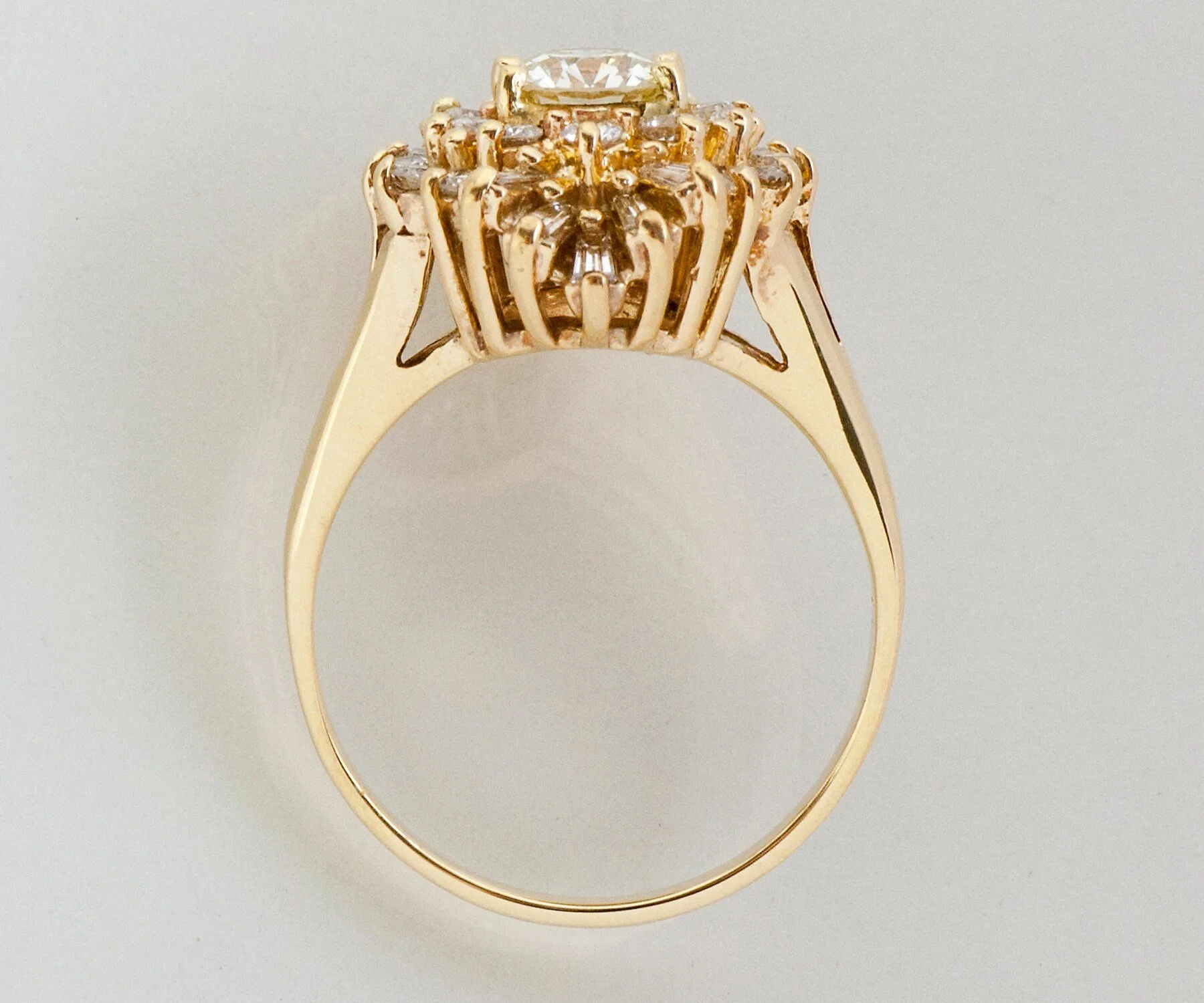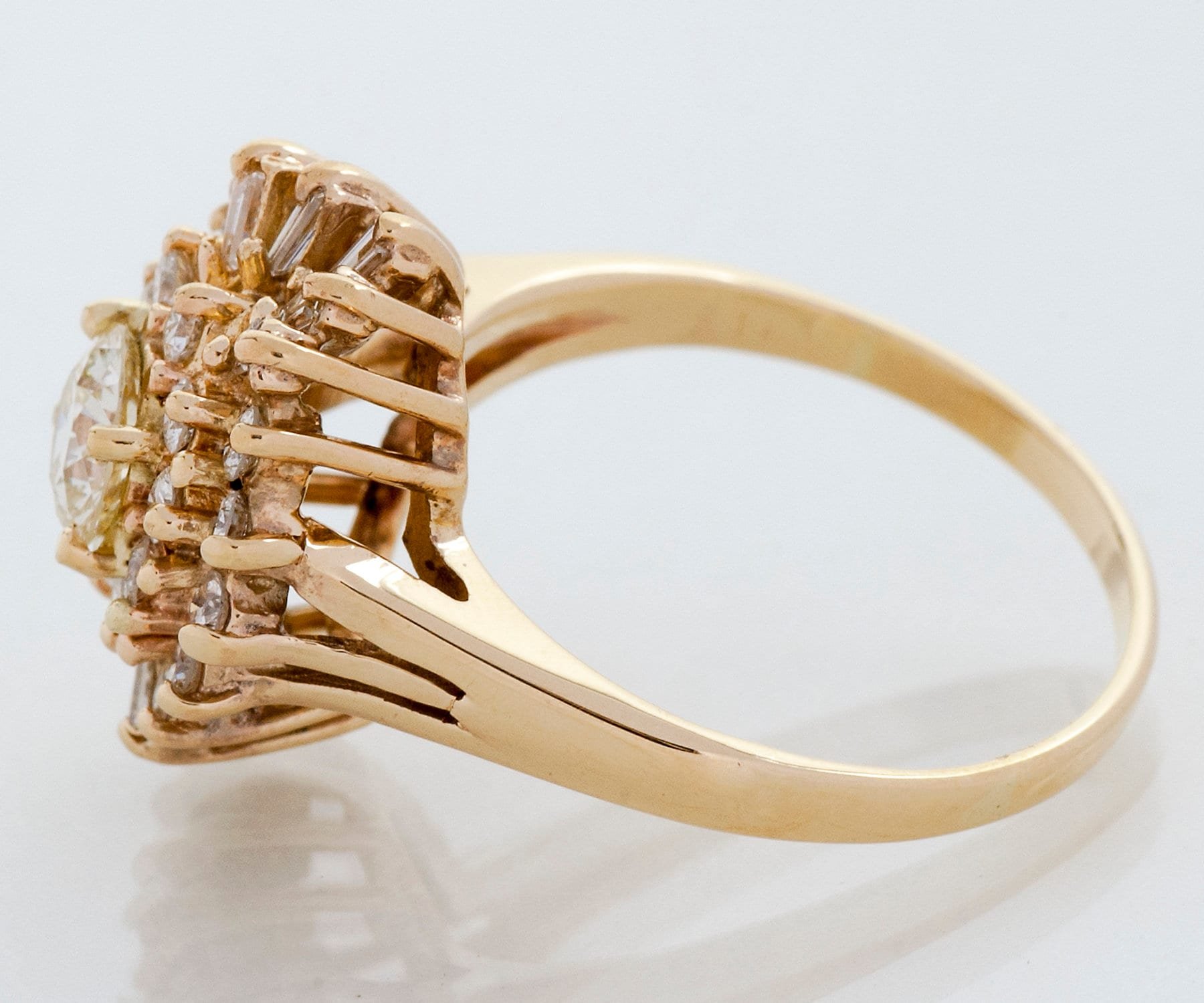 Gorgeous!!!!! This burst of beauty comes to us from the 1970's, so it is considered vintage. A sparkling center GIA certified round brilliant diamond is boldly surrounded by a bevy of round brilliant and baguette diamonds giving this piece a spectacular appearance. In bright and beaming 14 k yellow gold, this ring is an absolute show-stopper as your engagement or right-handed ring.