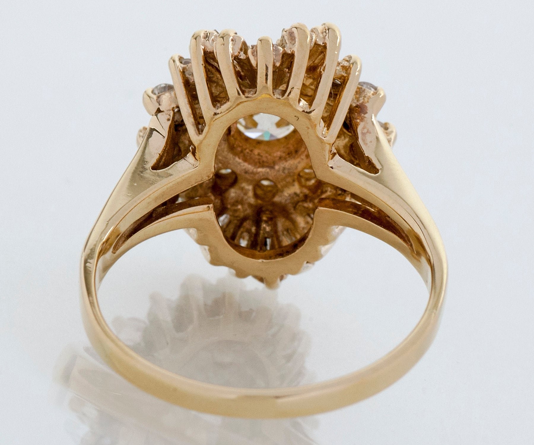 Gorgeous!!!!! This burst of beauty comes to us from the 1970's, so it is considered vintage. A sparkling center GIA certified round brilliant diamond is boldly surrounded by a bevy of round brilliant and baguette diamonds giving this piece a spectacular appearance. In bright and beaming 14 k yellow gold, this ring is an absolute show-stopper as your engagement or right-handed ring.