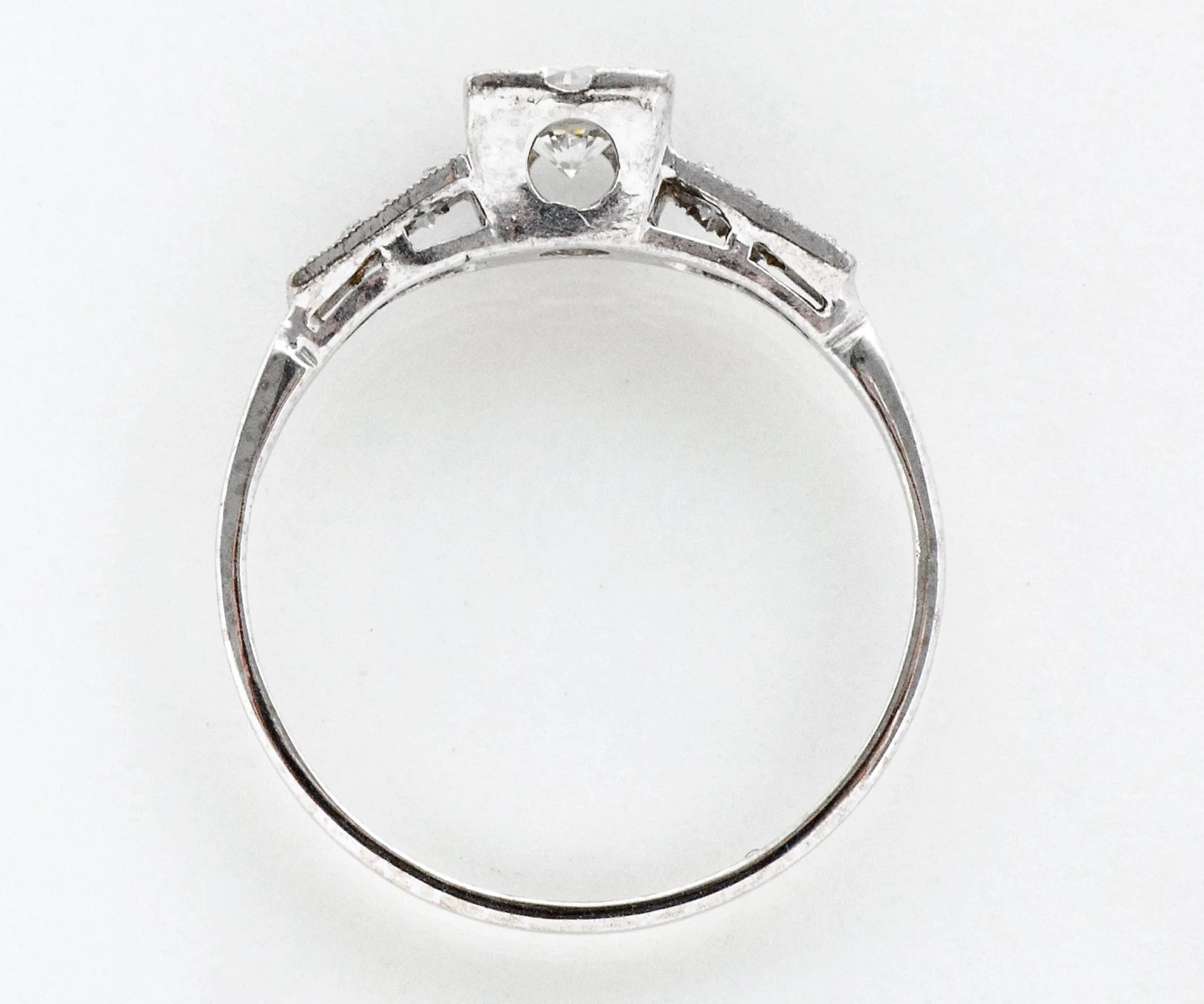Crisp and clean with sharp lines is this 1940's 14k white gold diamond engagement ring. A round brilliant cut diamond sits at the center of this beauty, nestled within high polished prongs in a square setting. In the gallery, a peep hole can be seen where the pavilion and culet can be visualized. Accompanying side sparkling diamonds further adorn this vintage ring enhanced by a fine milgrain edge.