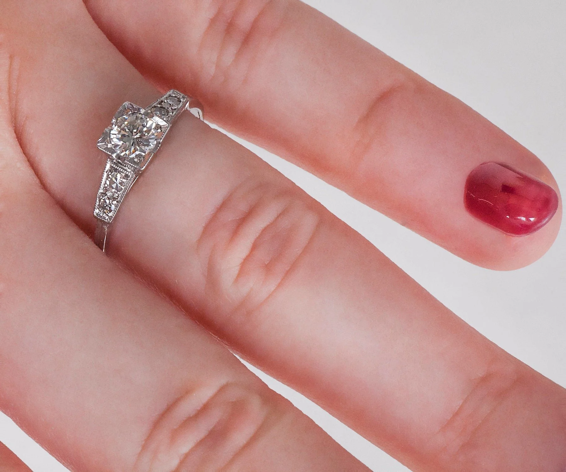 Vintage Engagement Ring - Vintage 1940's 14k White Gold Diamond Engagement Ring 1940's 14k White Gold Round Brilliant Center Diamond =.34ct VS1/G 4 Side Diamonds =.11ct VS1/G-H Ring Size 6.5 (ring is sizable) Ring measures approximately 5.4mm at center, back of band is 1.4mm wide.