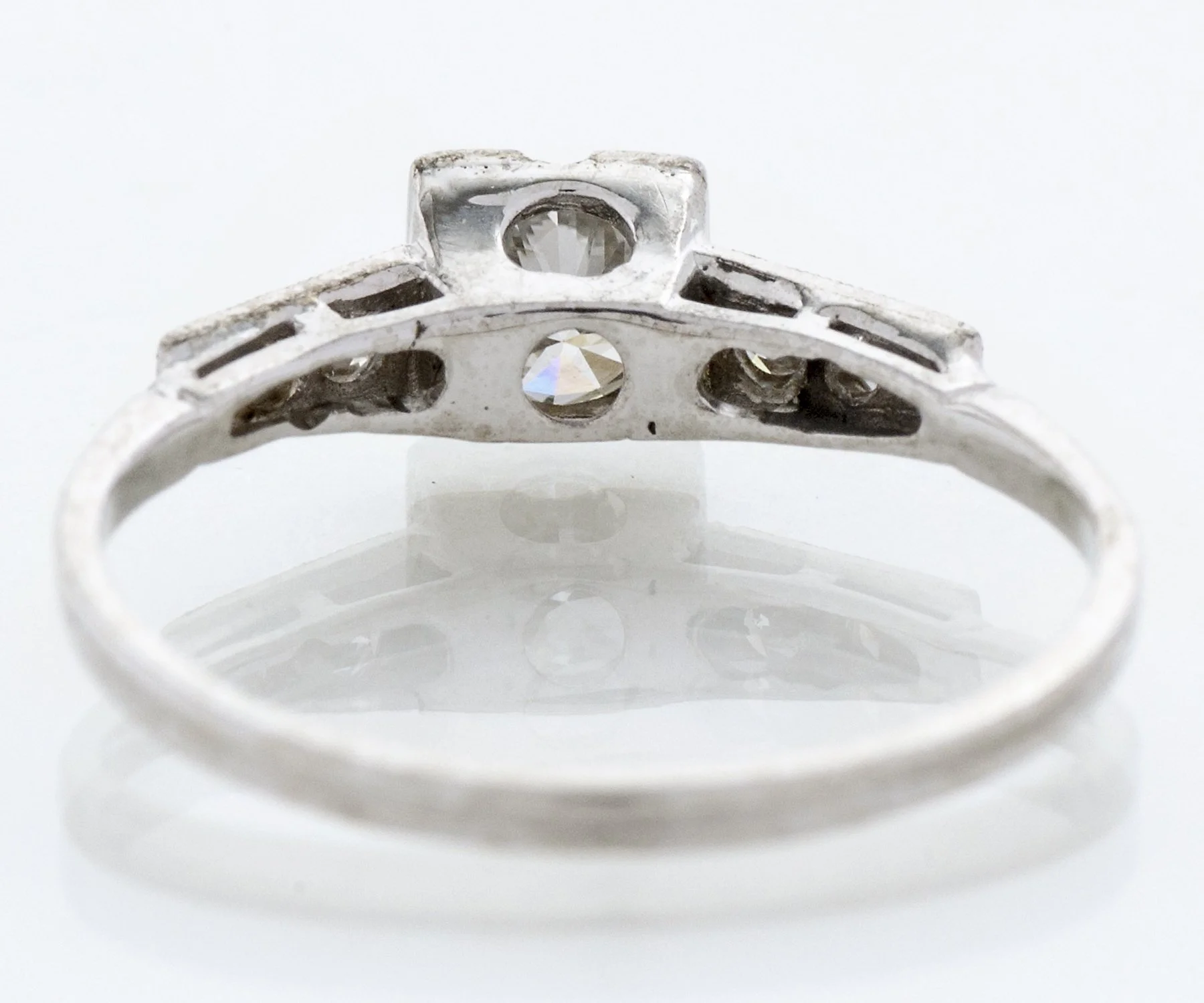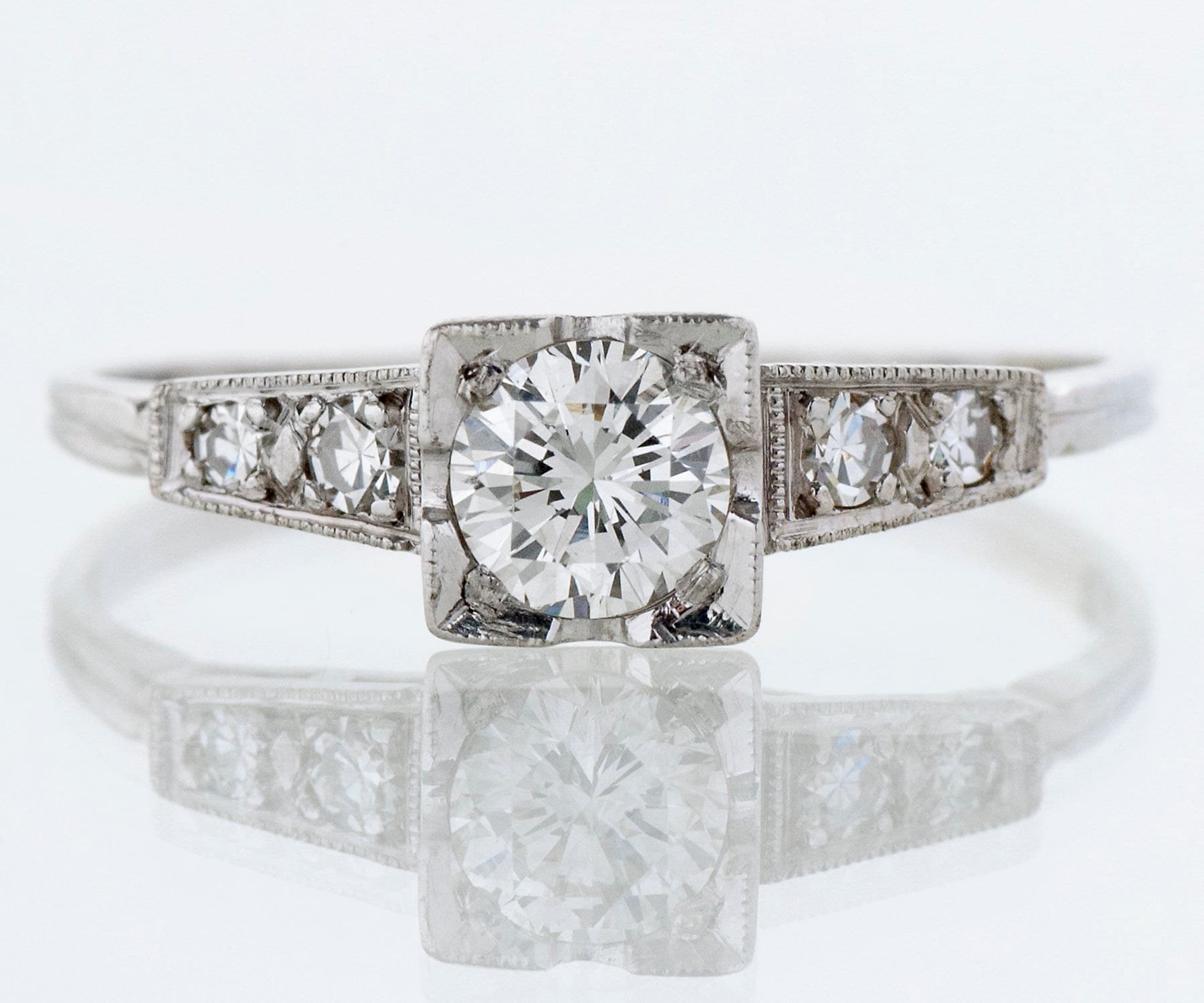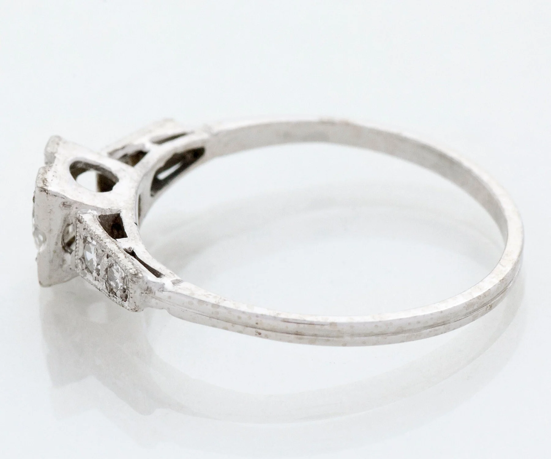 Vintage Engagement Ring - Vintage 1940's 14k White Gold Diamond Engagement Ring 1940's 14k White Gold Round Brilliant Center Diamond =.34ct VS1/G 4 Side Diamonds =.11ct VS1/G-H Ring Size 6.5 (ring is sizable) Ring measures approximately 5.4mm at center, back of band is 1.4mm wide.