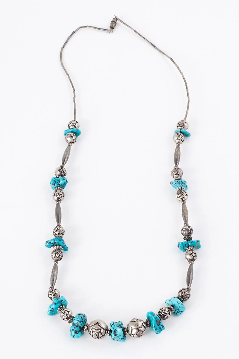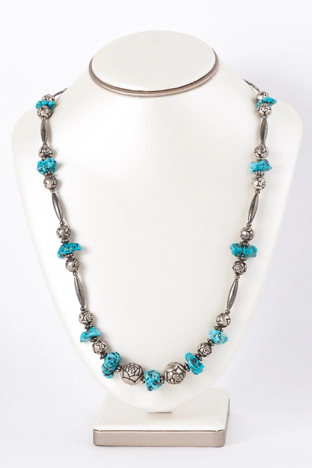 This very pretty necklace features rough bright blue turquoise nuggets and rose etched sterling silver beads. The perfect gift to give for a gal looking to make a bright statement. We have chosen not to polish this item as the natural patina shows the age. However, upon purchase if requested we will polish the sterling silver.