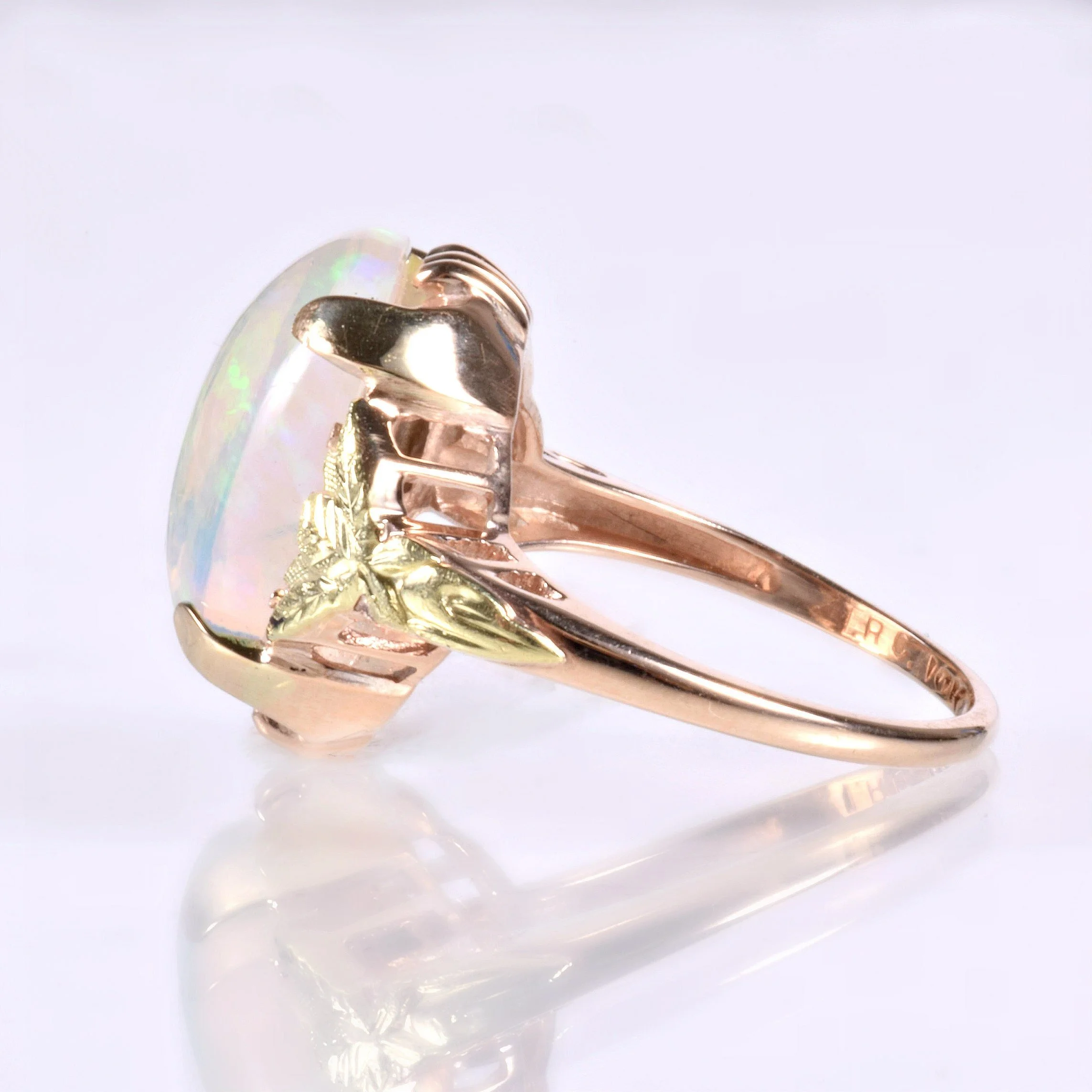 The star of the show here is our large 4.78 carat fiery crystal opal, but note the fabulous leaf engraving on either side...crisp and in green gold! The remainder of this vintage ring from the 40's was crafted in rich rose gold and the blending of colors is outstanding. The inside is stamped I.R.C., which stands for International Ring Co, c.1943: Lafayette Bldg. Buffalo NY.