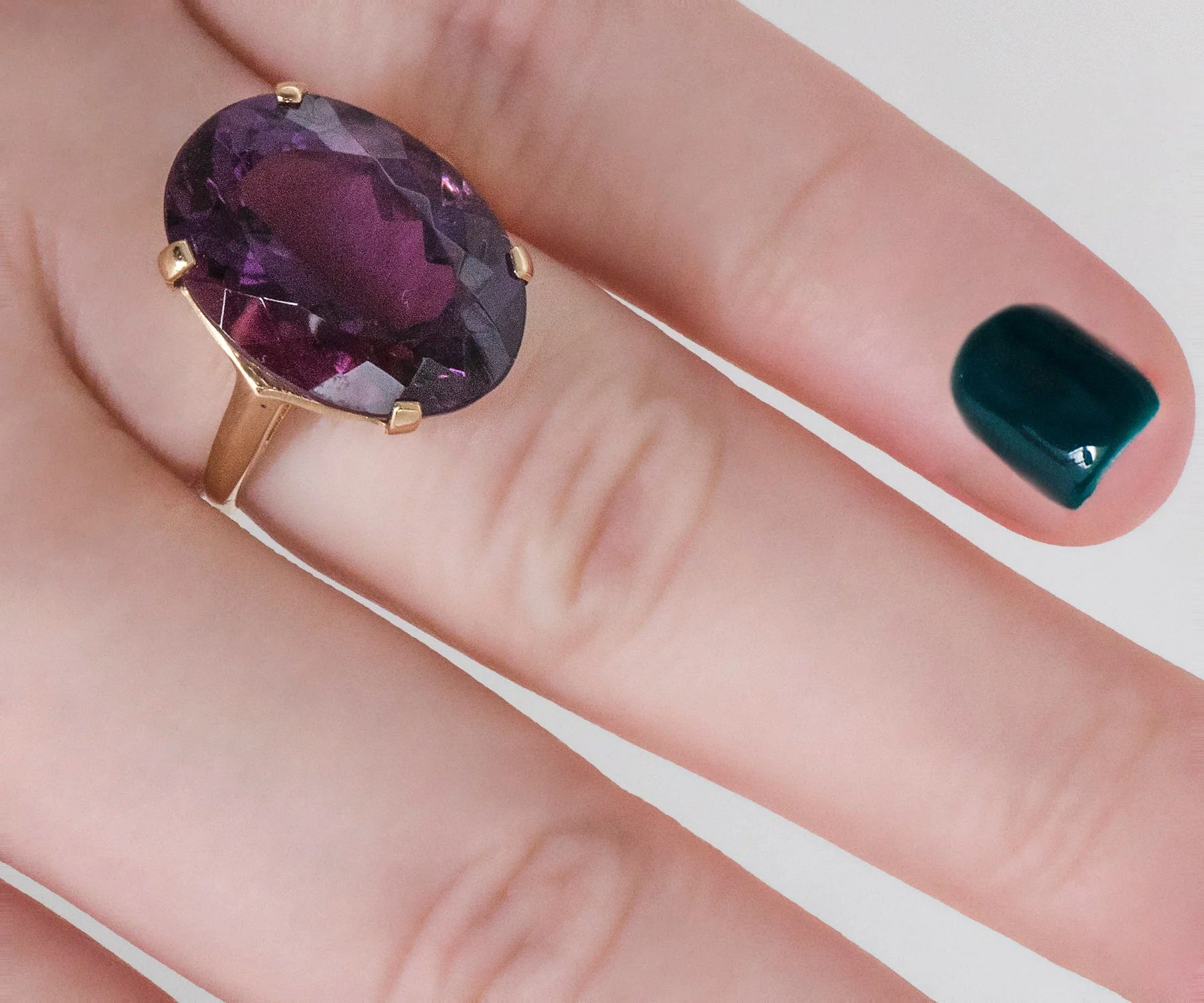 Understated? NOPE! This one will earn you a little attention, positive attention of course. If you love the amethyst gemstone, or if you are a February baby, this may be the beauty you have been searching for. Aside from the charm of being vintage, this ring is all gemstone. The 14k yellow gold setting is very simple so as not to take away from the enormity and flash of the very large oval amethyst. Side note, due to the size and cut of this gemstone, one can feel the bottom of the stone on the finger, so we recommend sizing up slightly from normal size for comfort.