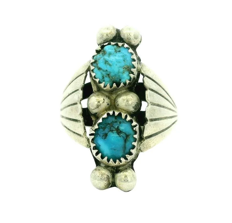 This vintage double turquoise ring in sterling silver is very eye catching with it's North-West design and textured bezel detail surrounding the stones. The turquoise is a beautiful blue with dynamite matrix throughout.