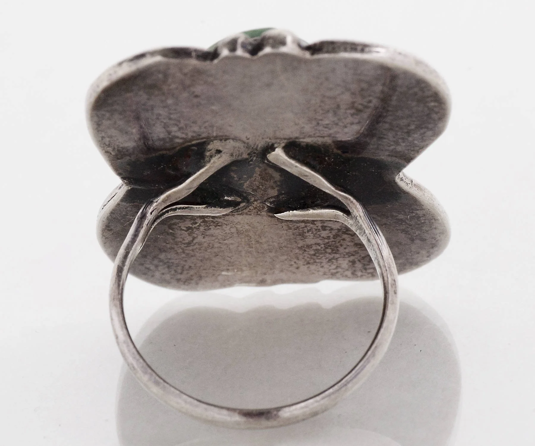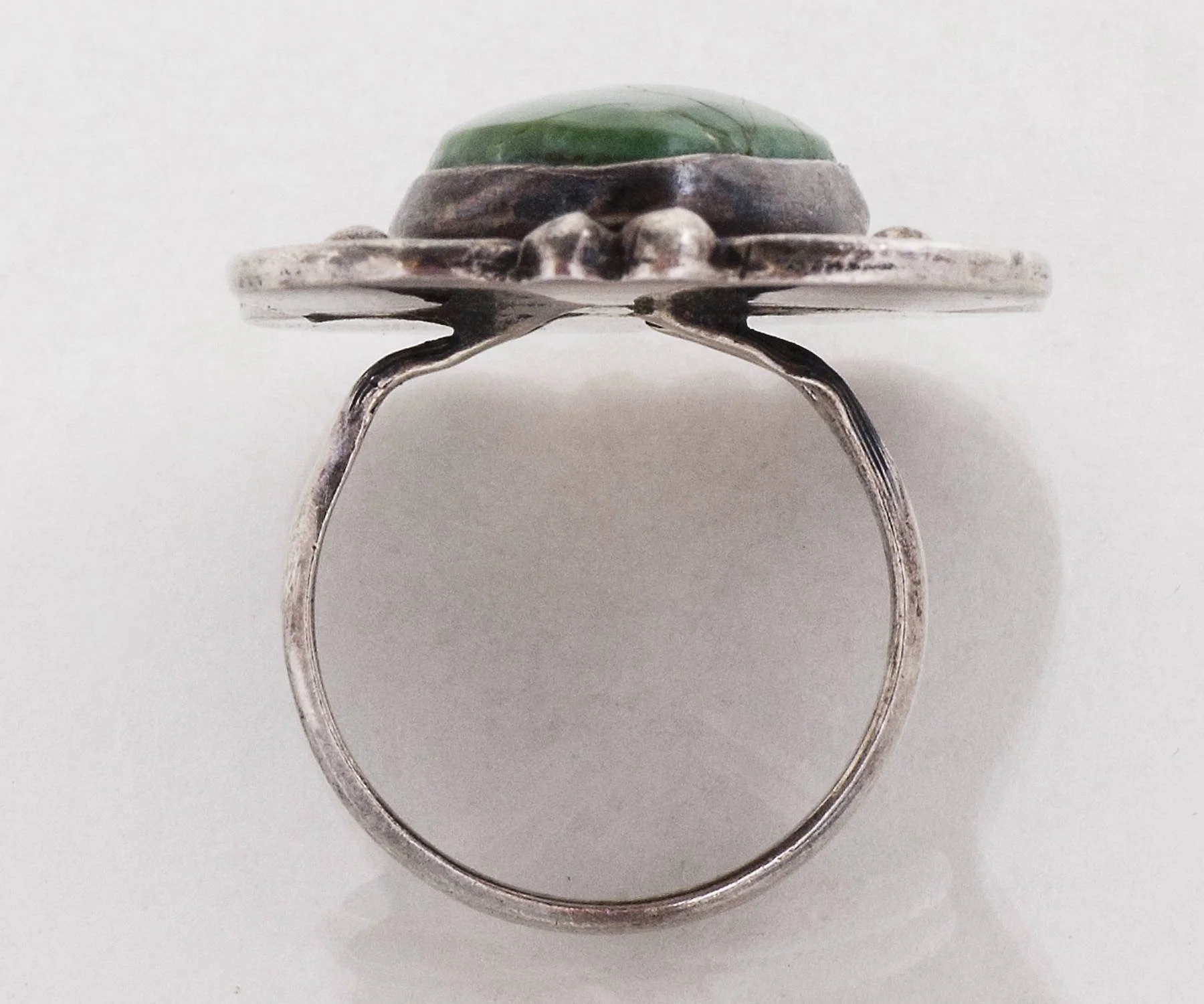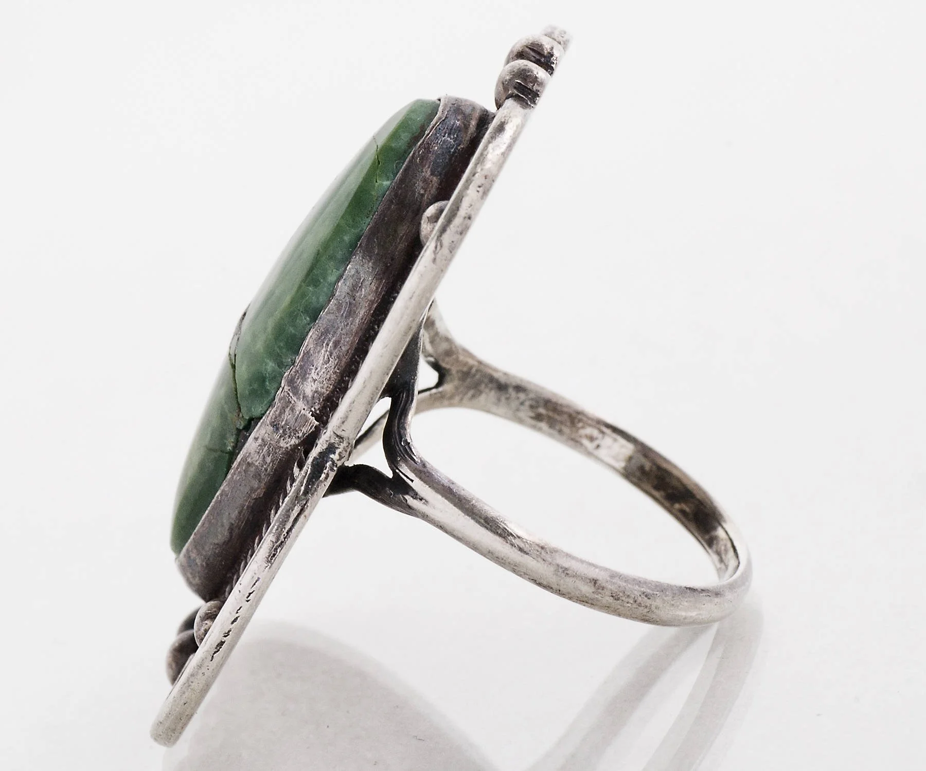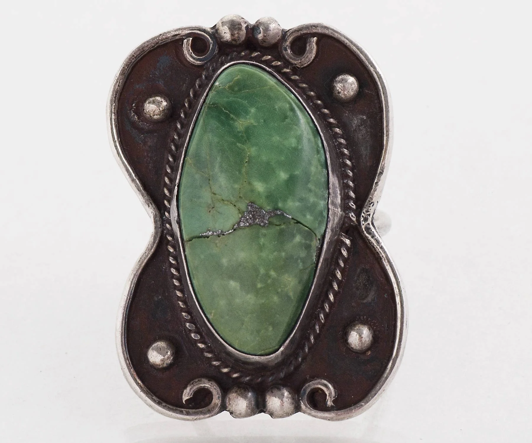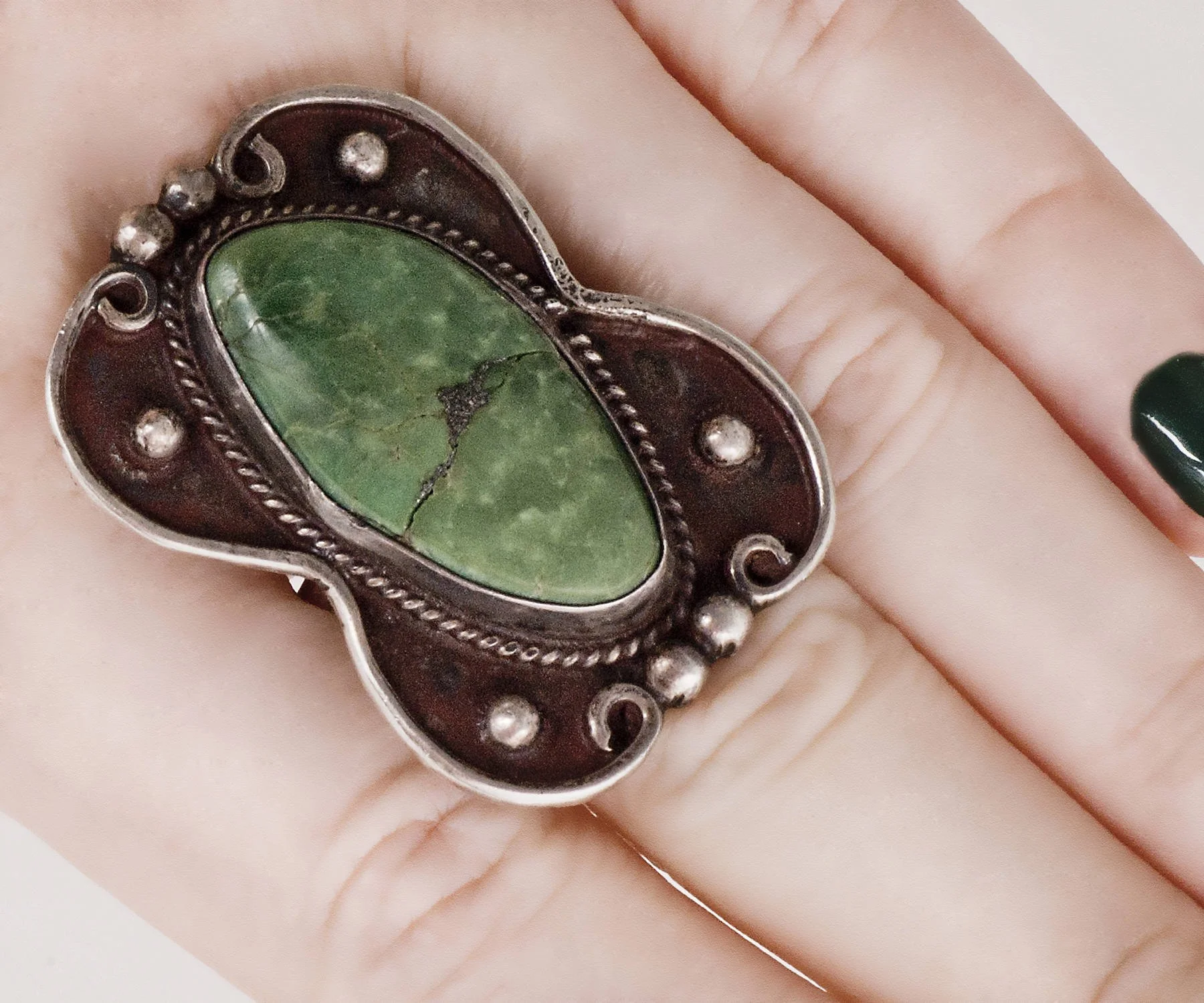 A fabulous vintage statement ring for sure, this large green turquoise resides comfortably within it's shadowbox effect setting. A wonderful color in a fabulous size! Very comfortable on the finger.