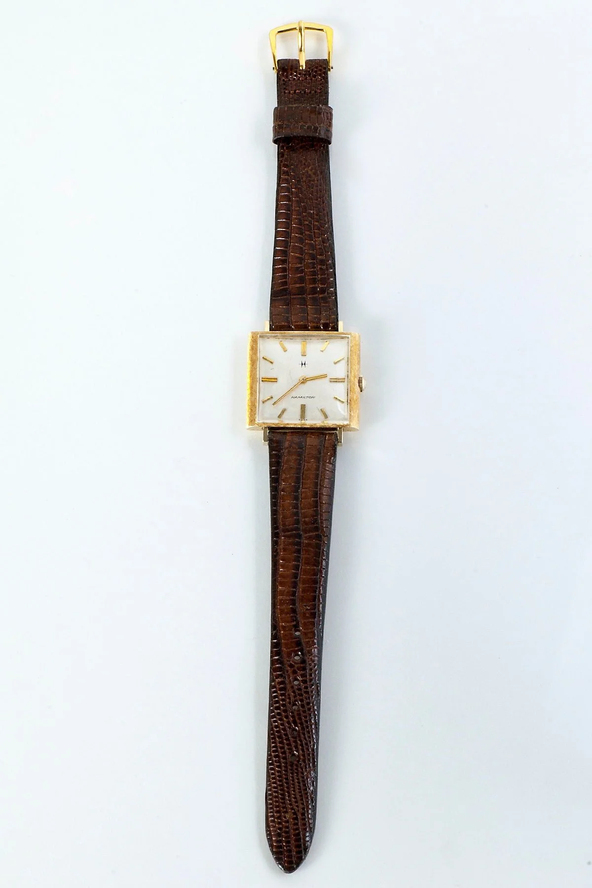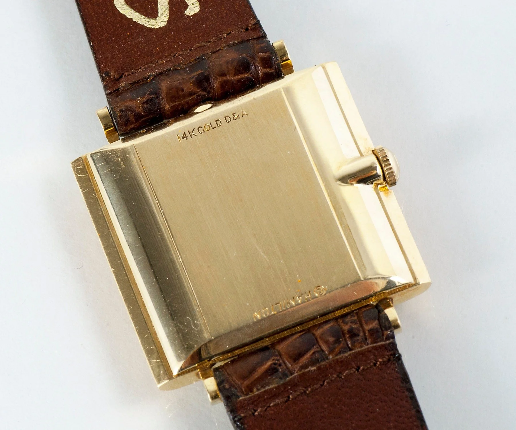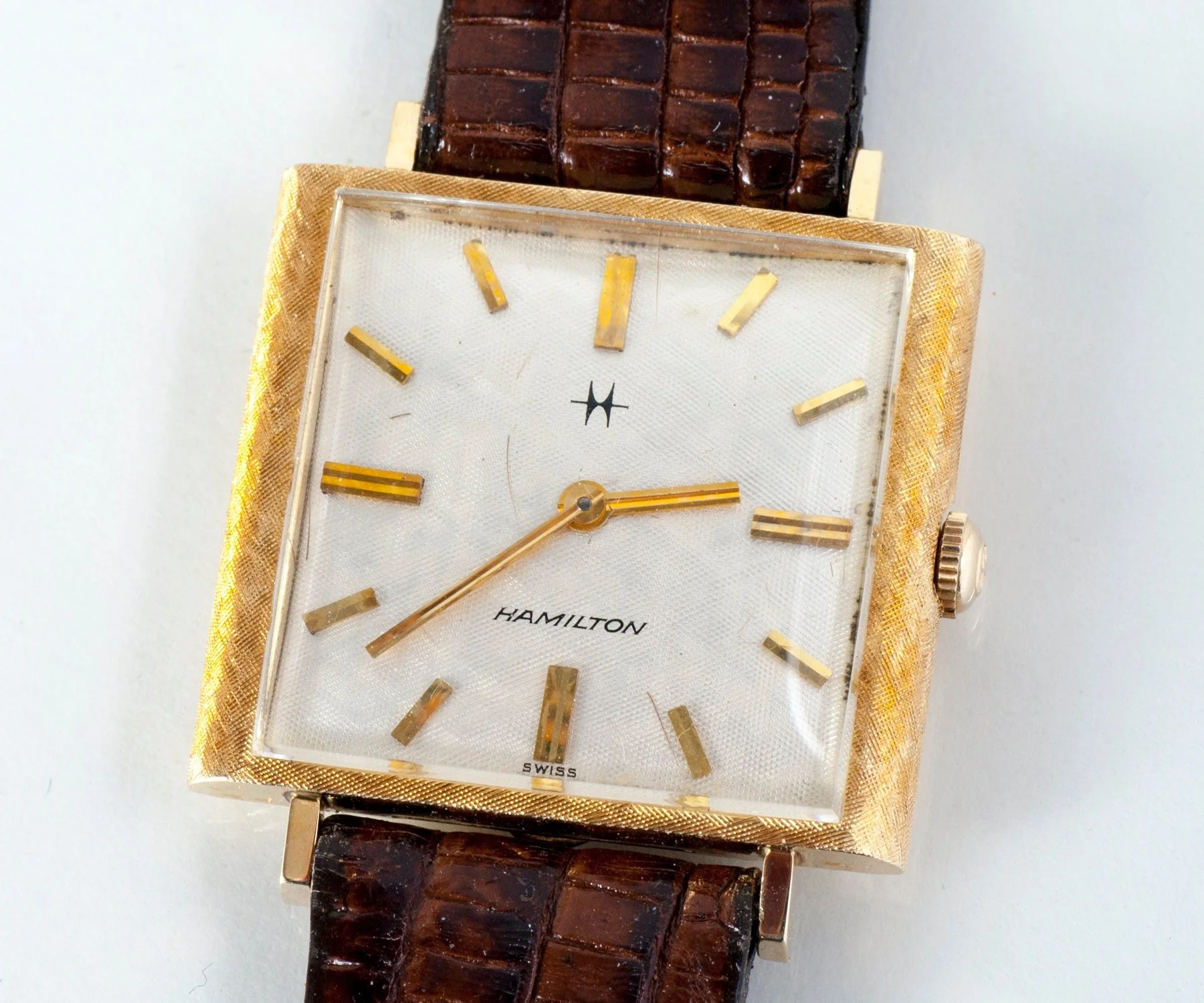 This special mid-century men's (or women's!) Hamilton wrist watch is very handsome indeed. For the lover of vintage watches. Featuring a very pretty florentine textured surface on the 14k yellow gold case. The leather band is a new one.