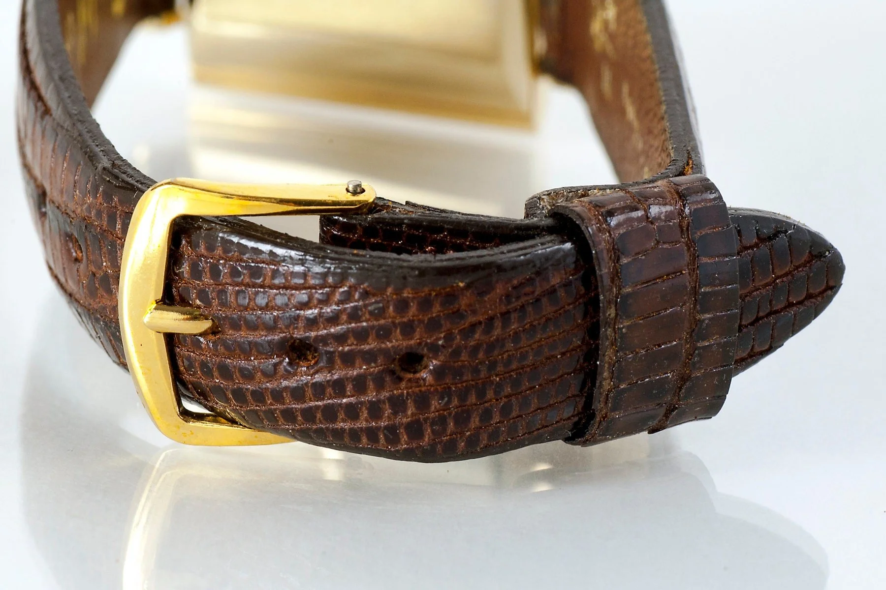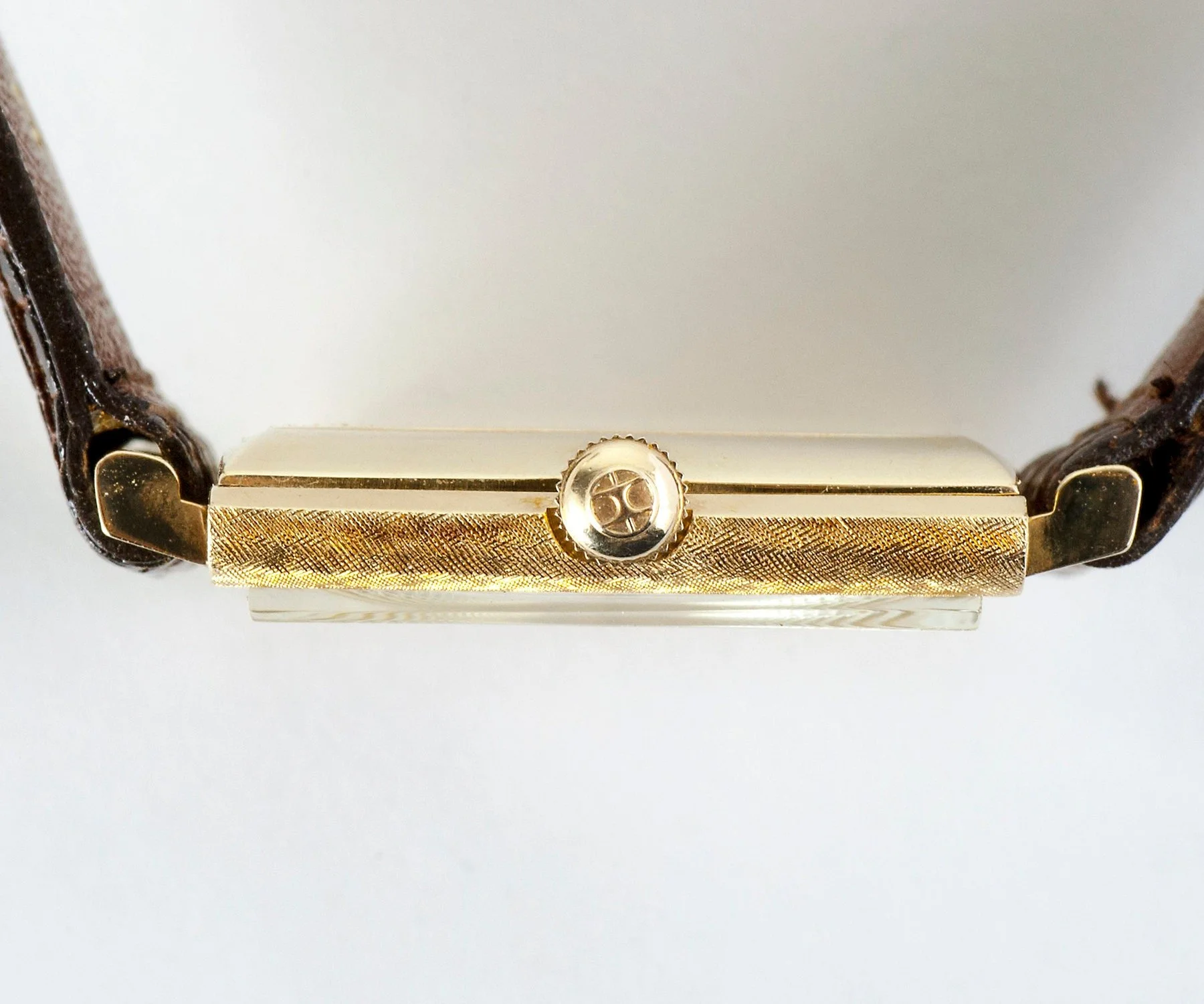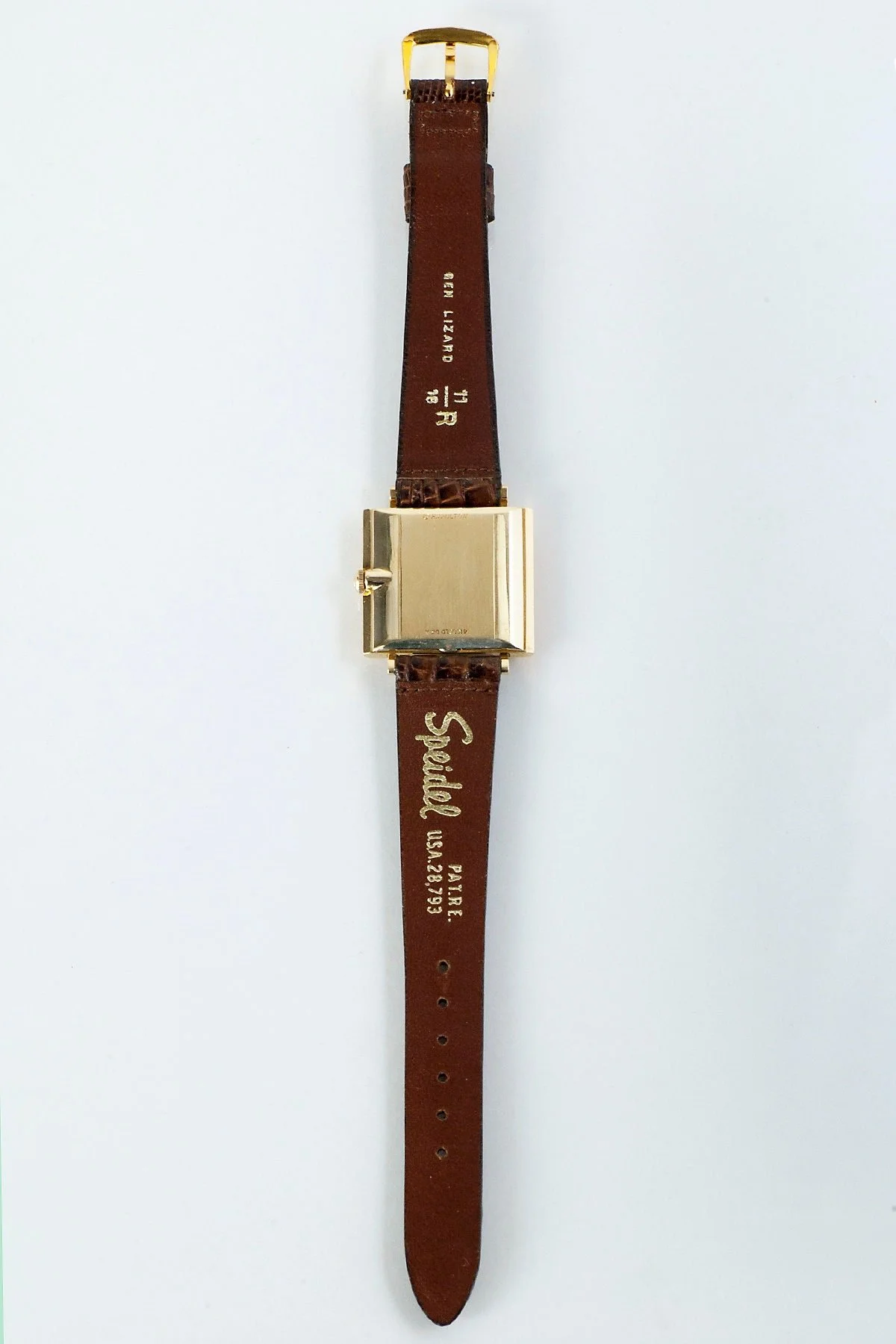 This special mid-century men's (or women's!) Hamilton wrist watch is very handsome indeed. For the lover of vintage watches. Featuring a very pretty florentine textured surface on the 14k yellow gold case. The leather band is a new one.