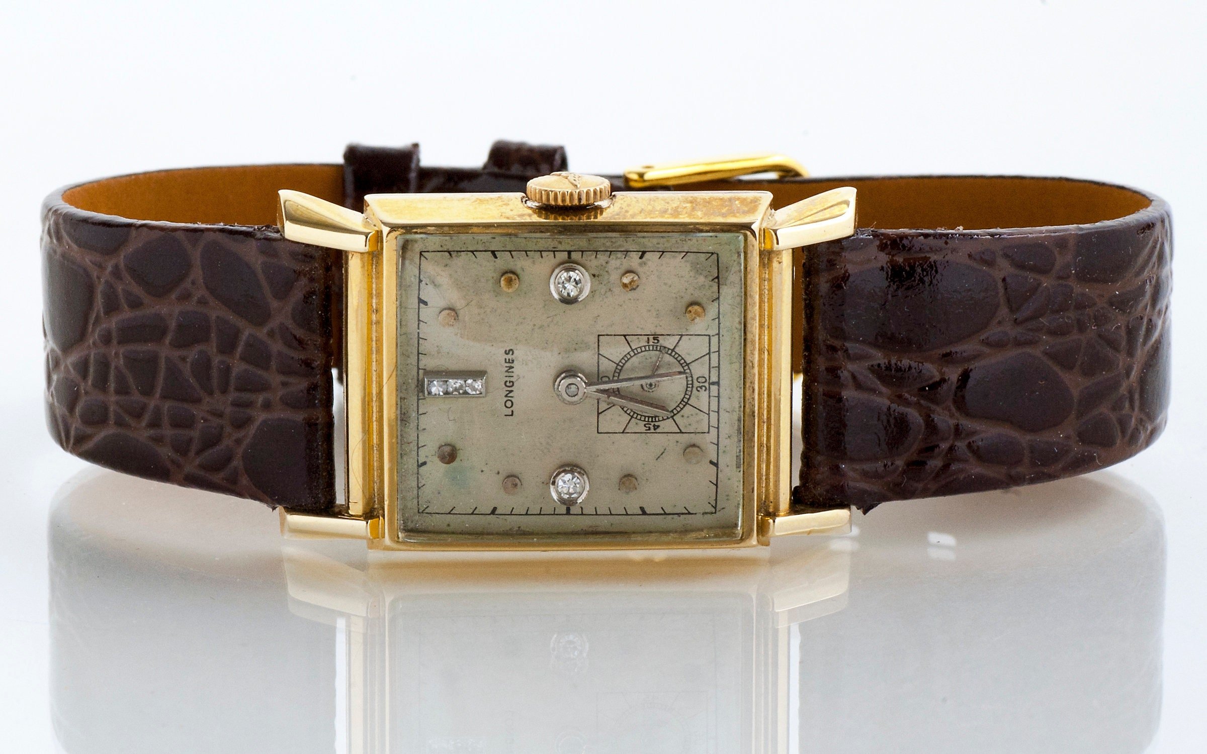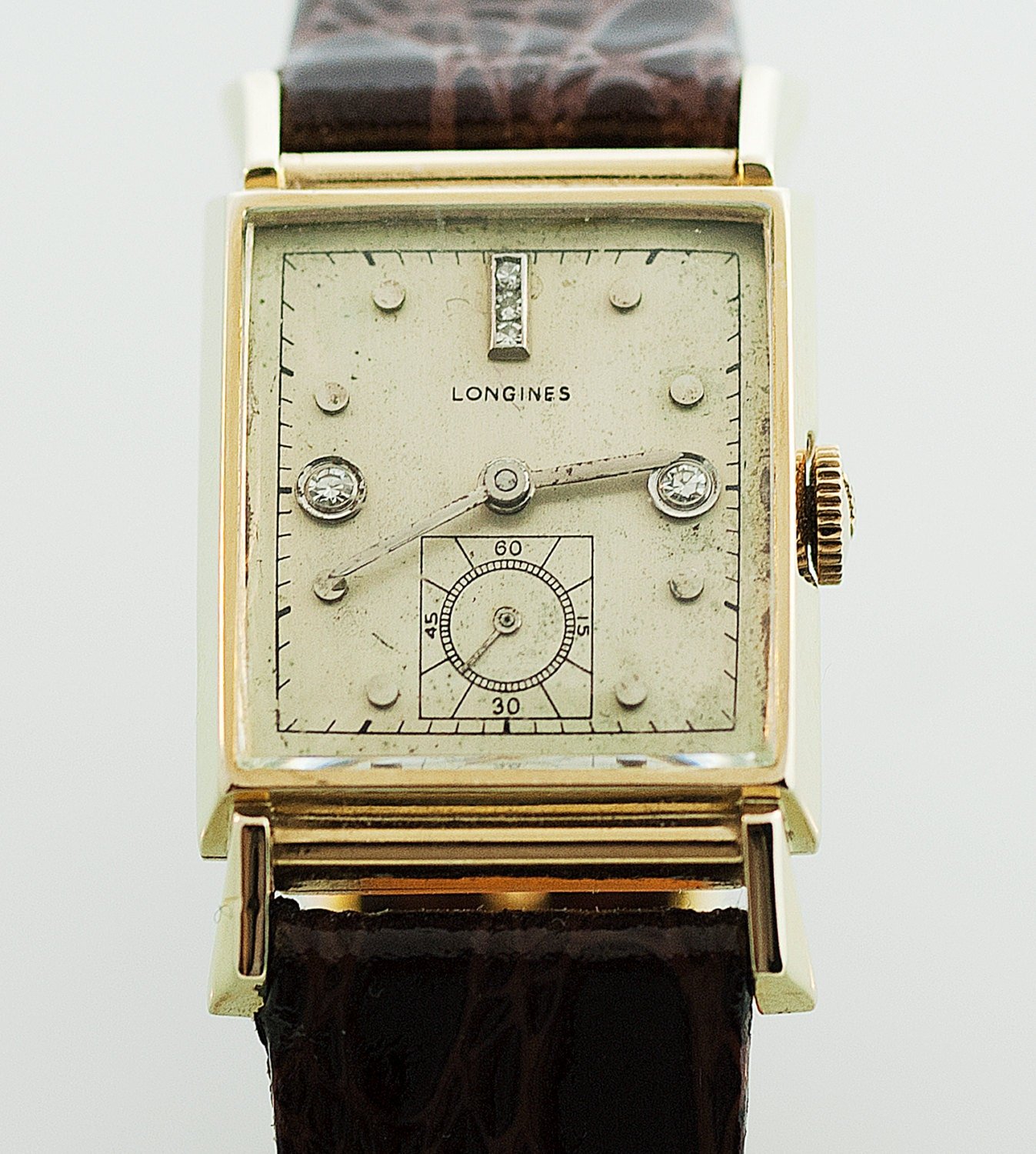 Vintage Watch - Vintage Men's Art Deco 1940's Longines 14k Yellow Gold Watch Longines Stamped 14k Yellow Gold Manual Wind 5 Single Cut Diamonds Acrylic Crystal Original crown The watch measures lug to lug 37mm The case measures 26 x 23mm Leather Strap The watch measures 8 inches in length