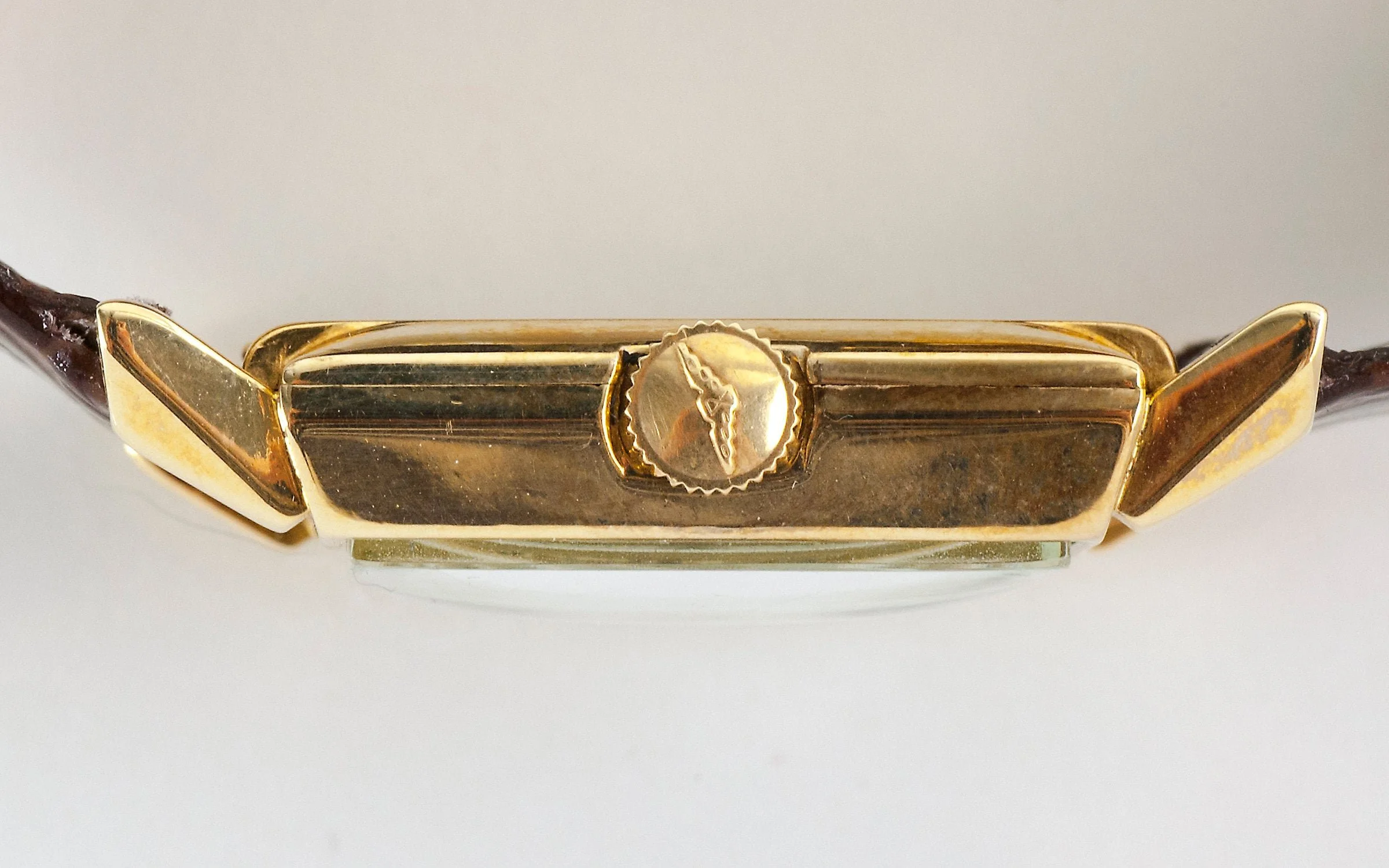 Vintage Watch - Vintage Men's Art Deco 1940's Longines 14k Yellow Gold Watch Longines Stamped 14k Yellow Gold Manual Wind 5 Single Cut Diamonds Acrylic Crystal Original crown The watch measures lug to lug 37mm The case measures 26 x 23mm Leather Strap The watch measures 8 inches in length