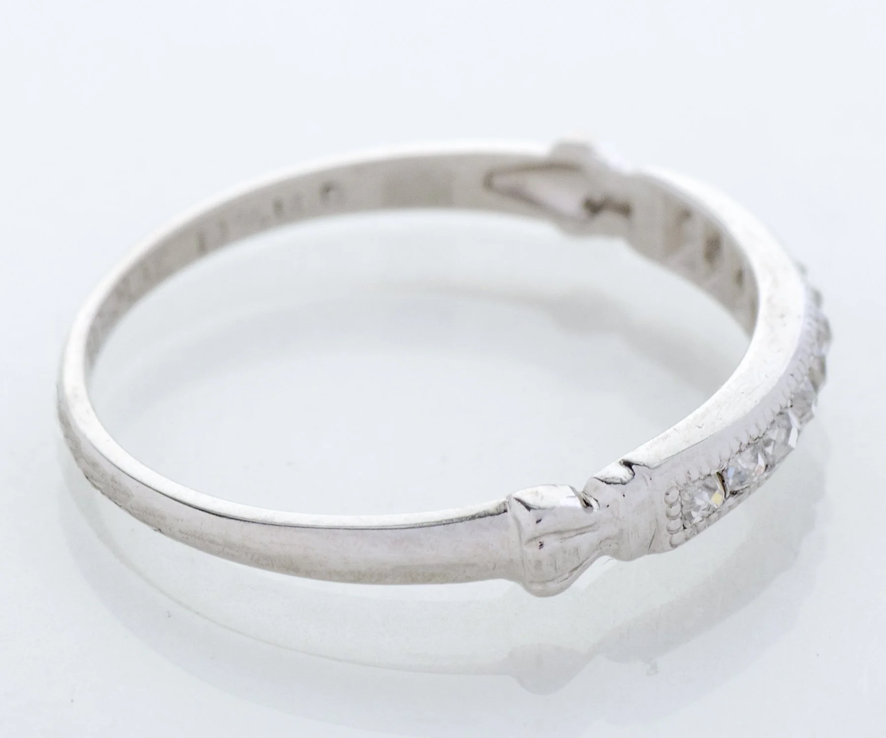 Ten shimmering French cut diamonds dance across the face of this oh so pretty antique wedding band from the Art Deco design period. A framework of crisp milgrain envelops them within the platinum setting. Pretty alone for sure, or coupled up with your engagement ring of any era.