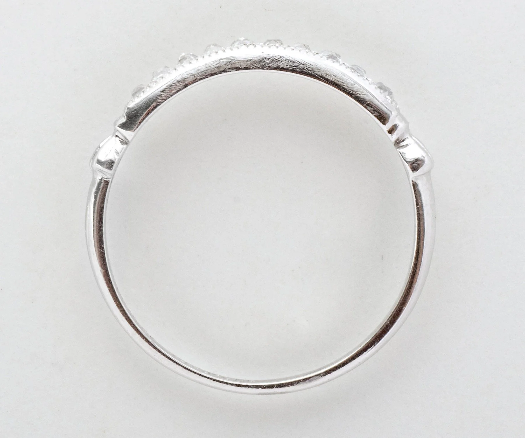 Ten shimmering French cut diamonds dance across the face of this oh so pretty antique wedding band from the Art Deco design period. A framework of crisp milgrain envelops them within the platinum setting. Pretty alone for sure, or coupled up with your engagement ring of any era.